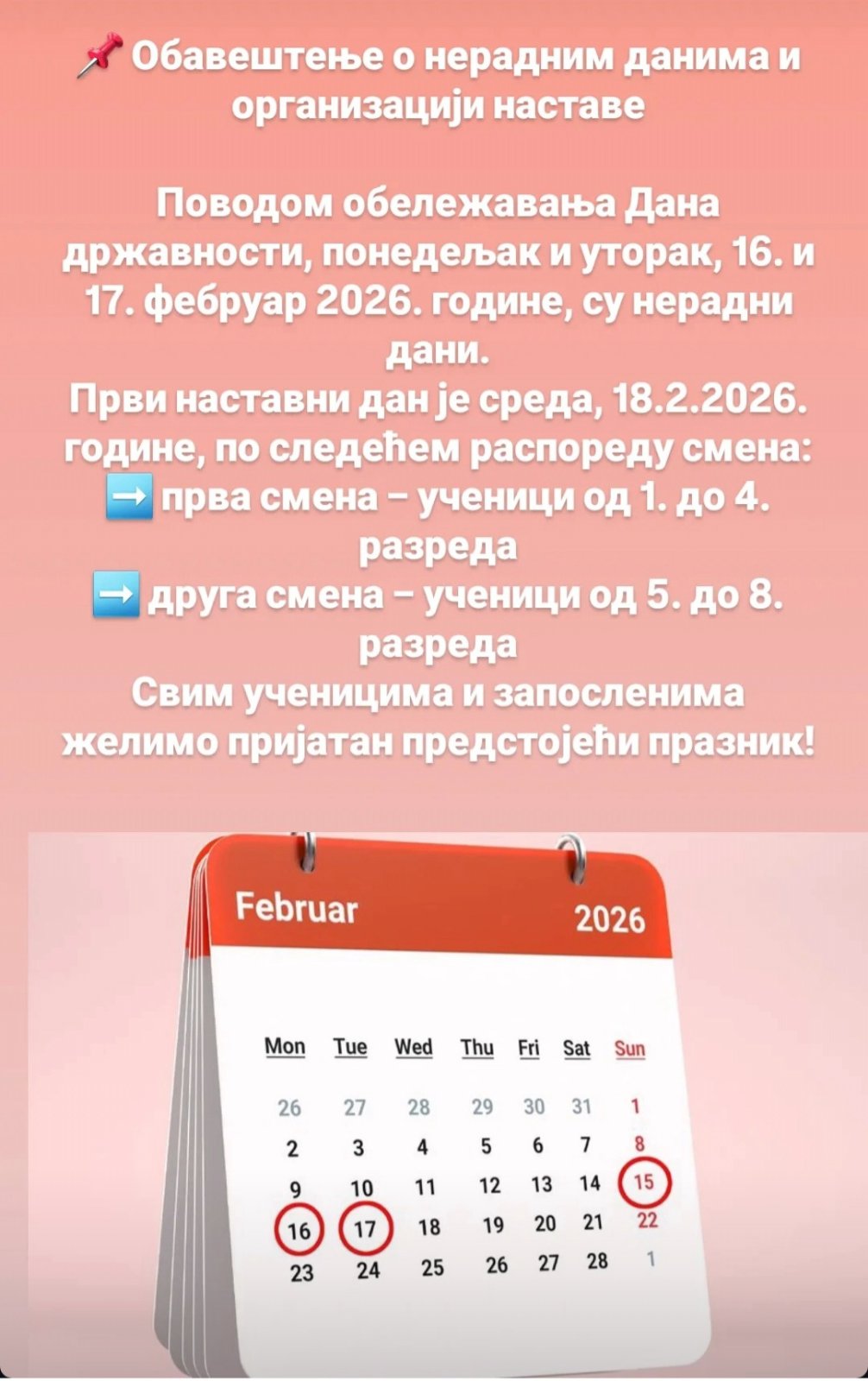 Oбавештење о нерадним данима и организацији наставе